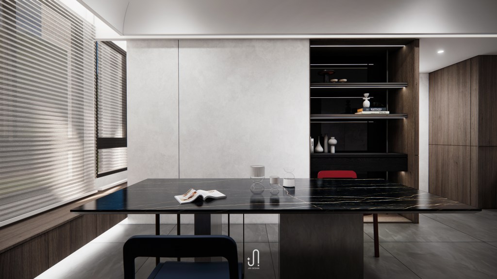 - 整體空間以灰色系手作塗料與溫潤原木色為基底,搭配黑白大理石材、織紋布料、金屬細節,呈現現代輕奢質感。